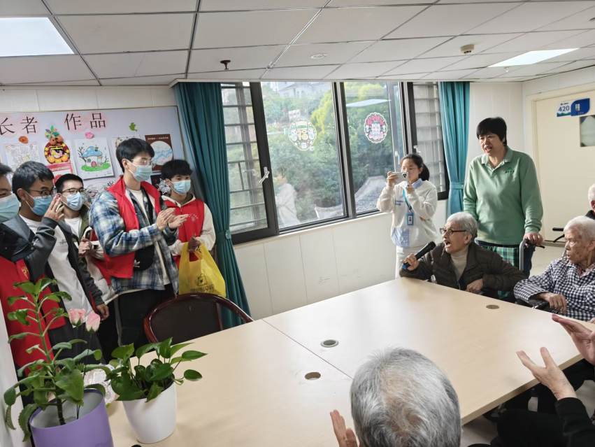 2025级计算机科学与技术4班团支部走进西园养老院送温暖。同学们精心准备的歌曲、舞蹈轮番上演,老人们看得喜笑颜开、掌声不断。趣味小游戏环节更是笑声阵阵,大家陪着老人唠家常,手把手教老人用扭扭棒做小花、小玩偶。五颜六色的扭扭棒在指尖翻飞,温馨的氛围弥漫在养老院的每个角落,这场活动既给老人们带去了欢乐,也让团员们在实践中读懂了志愿的意义。