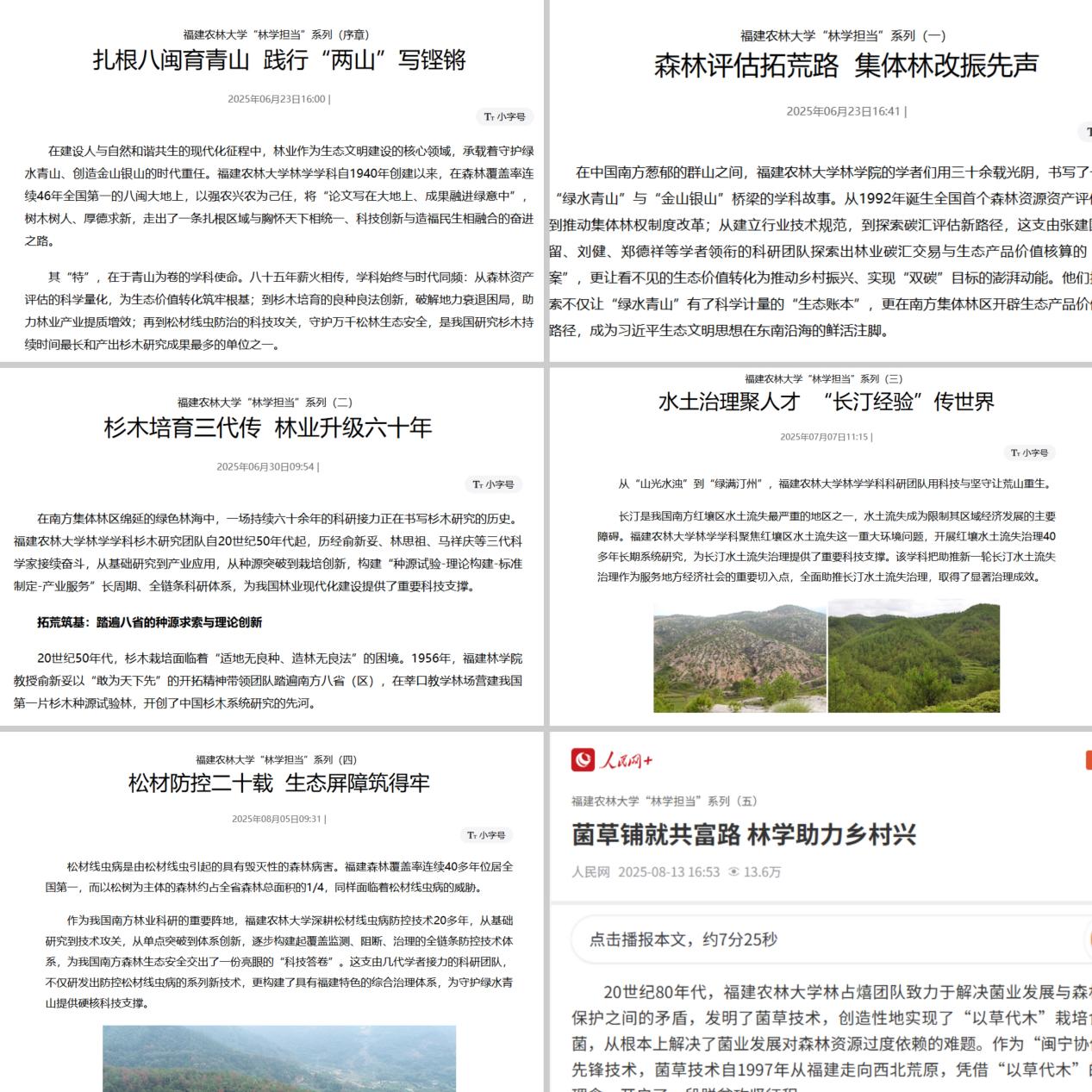 其中,人民网刊发的《杉木培育三代传 林业升级六十年》,文中回顾了学院三代杉木育种专家的奋斗历程,展示了杉木良种选育与推广对林业产业升级的推动作用,获得不少行业专家点赞。《beat365中文官方网站师生十年接力,共助“长汀经验”入选联合国典型案例》一文,则详细记录了学院师生十年如一日,接力参与长汀县水土流失治理,推动“长汀经验”走向世界的艰辛历程,单篇阅读量超65万。