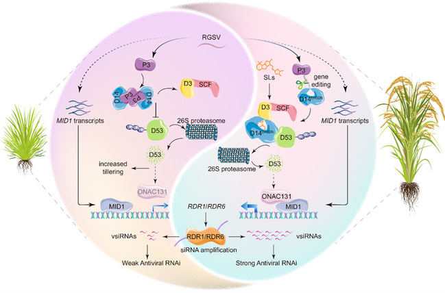 研究团队发现,多种水稻病毒侵染或过表达水稻草状矮化病毒(RGSV)编码的P3蛋白后,水稻植株会表现出矮化、分蘖增多等表型。通过系统的遗传学和分子生物学分析,首次证实独脚金内酯通路是水稻抗病毒免疫所必需的。进一步研究表明,独脚金内酯通路介导的抗性具有显著广谱性,不仅对RGSV有效,还可同时抑制呼肠孤病毒目下多种重要水稻病毒,包括水稻锯齿叶矮缩病毒、南方水稻黑条矮缩病毒和水稻黑条矮缩病毒。