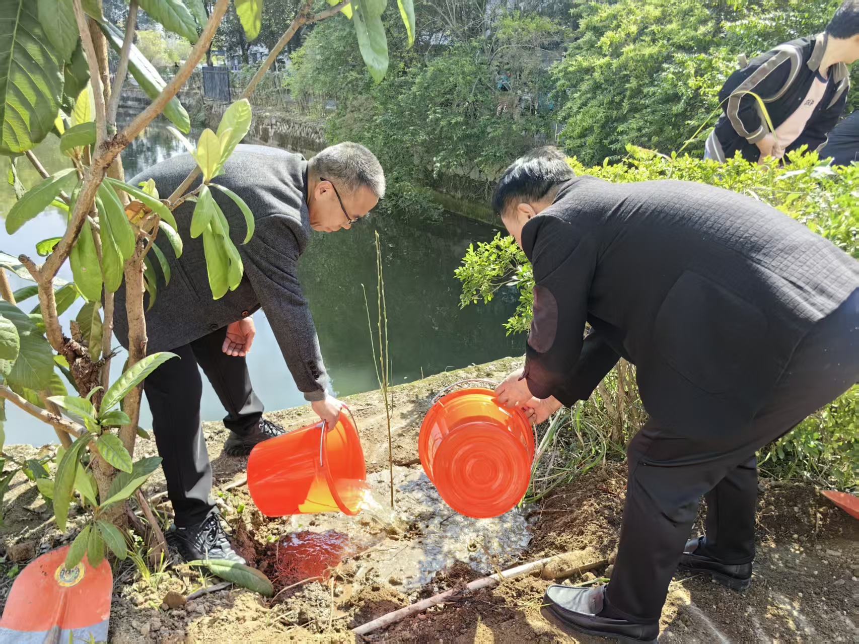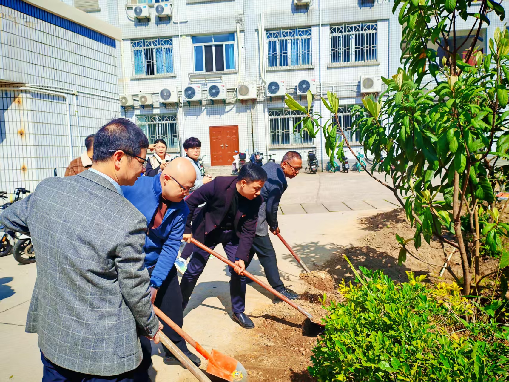 植树现场暖意融融,党员同志和师生代表分工协作、配合默契。挥锹铲土、扶苗填坑、提水浇灌……大家一丝不苟、步步到位,每道工序都认真细致,现场气氛热烈而有序。经过大家的共同努力,一株株新栽的桃树苗稳稳扎根沃土,在春风中挺立吐绿,为春日的校园增添了盎然生机。