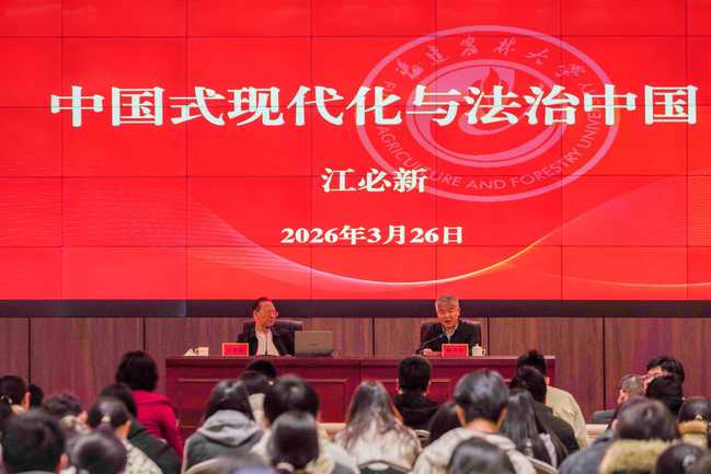 报告会上,江必新教授围绕“中国式现代化与法治中国”这一主题,从现代化基本内涵及各国实现现代化的主要类型、现代化的共同特征与中国式现代化的核心特质、各国现代化与法治的共同需求以及中国式现代化对法治的特殊需求、中国式法治的基本特点与未来走向、法治中国的基本构成及其实现路径、农林院校如何与法治中国式现代化同频发展等六个方面展开系统阐述,对改革开放以来中国法治建设的各种讨论做出了回应。整场报告贯通历史与现实、融汇理论与实践,既有世界眼光,又有中国立场,展现了深厚的理论功底与强烈的现实关怀。