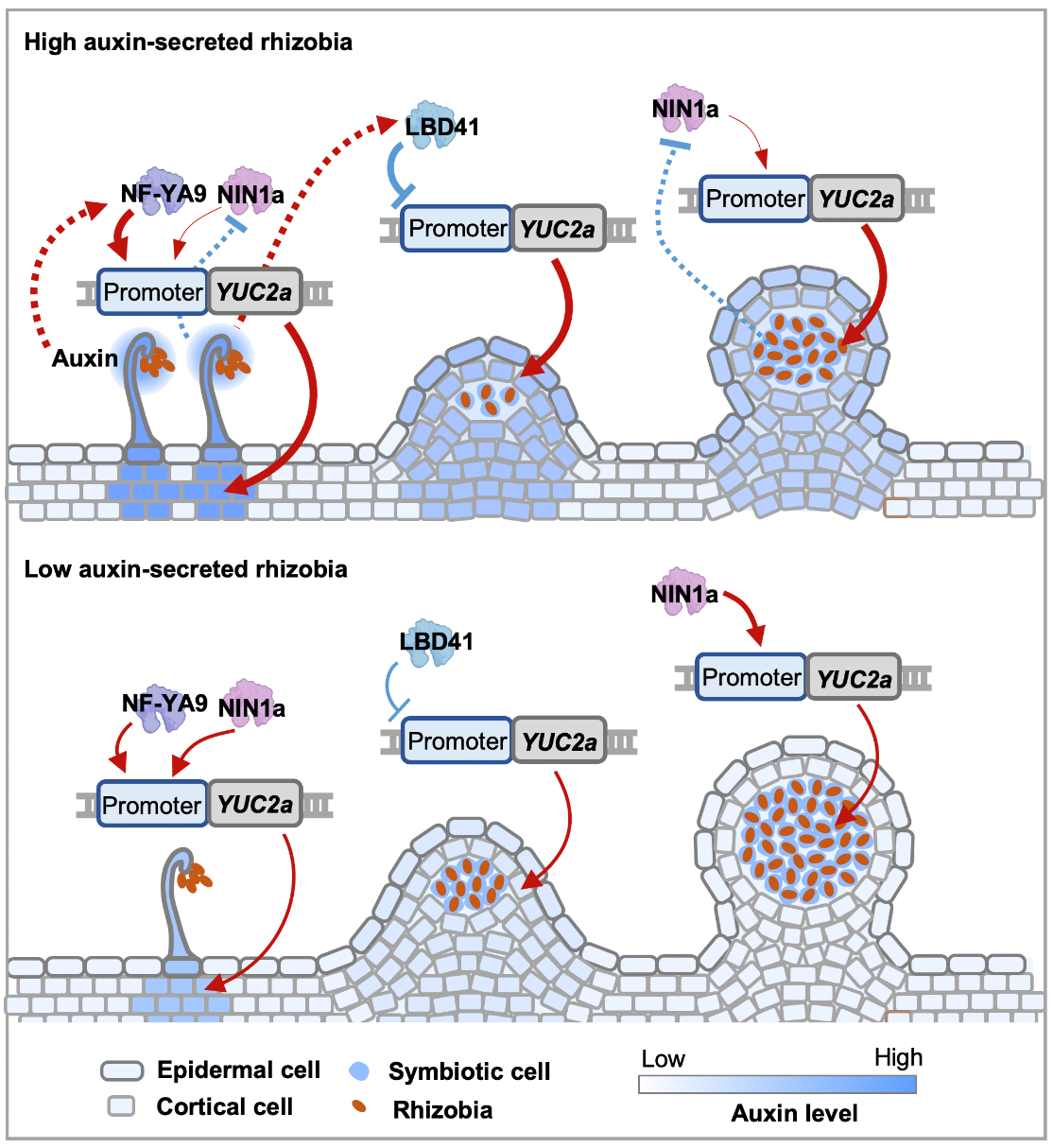 研究表明,根瘤菌源生长素可直接激活植物体内YUC2介导的生长素合成途径,进而调控根瘤在各发育时期的进程。为明确该调控机制的空间特异性,研究构建了不同细胞层面启动子驱动的生长素特异性表达体系。结果显示:当YUC2在皮层细胞特异高表达时,根瘤原基密度显著升高;然而,高水平生长素同时抑制了根瘤原基中根瘤菌的定殖,导致根瘤无法正常膨大和固氮。相反,基因编辑获得的YUC2a/b双突变体(yuc2ab)则表现出根瘤数量减少的表型,且对根瘤菌源生长素诱导的根瘤密度增加不敏感。综上,皮层细胞是根瘤菌源生长素信号的核心响应位点,其通过高浓度生长素促进根瘤发生,但过量生长素又会抑制根瘤菌定殖,从而揭示了生长素信号在根瘤发育中的空间特异性调控机制。
