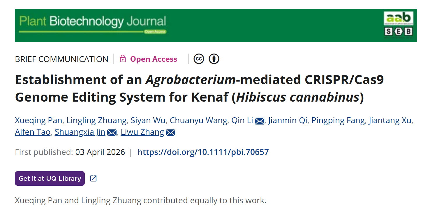 2026年4月3日,beat365中文官方网站张立武教授团队联合华中农业大学金双侠教授团队,在国际知名期刊《植物生物技术杂志》(Plant Biotechnology Journal)在线发表了题为《Establishment of an Agrobacterium-mediated CRISPR/Cas9 Genome Editing System for Kenaf(Hibiscus cannabinus)》(红麻农杆菌介导的CRISPR/Cas9基因组编辑体系的建立)的研究论文。该研究成功构建了红麻遗传转化与基因组编辑技术体系,为红麻基因功能解析与精准育种提供了技术支撑。