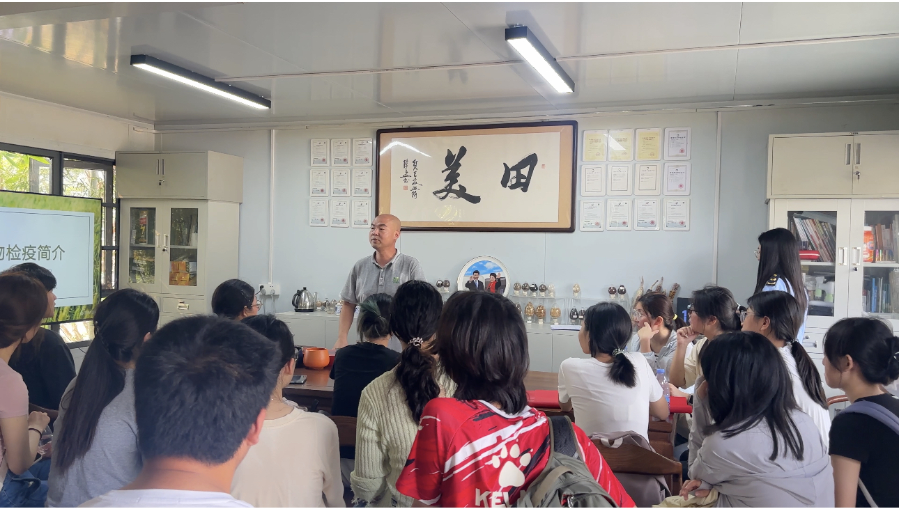 在实践基地,植检站工作人员与公司负责人围绕农业检疫对象、申报与检疫流程、检疫处理措施及典型案例开展现场教学。通过案例引导与情境讲解,引导学生深刻认识到植物检疫在国家生物安全体系中的“前沿哨兵”作用。