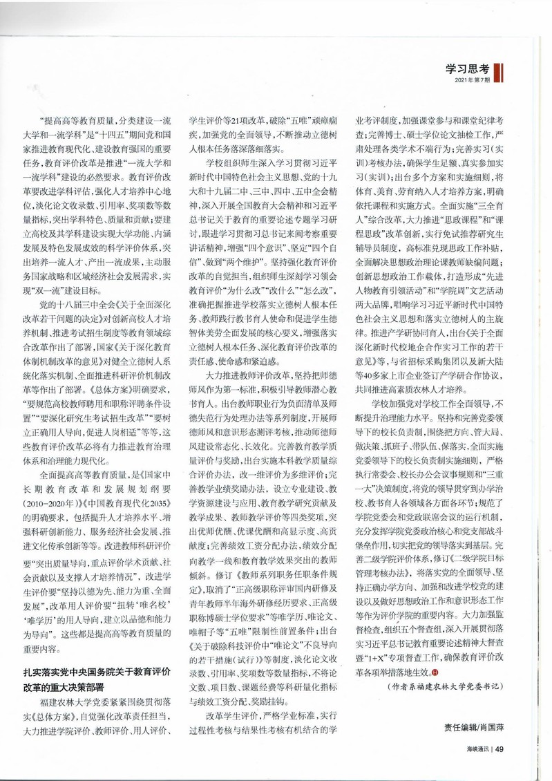 编者按:中共福建省委主管主办的综合性时政期刊《海峡通讯》刊登beat365官网党委书记严金静的署名文章《坚持以教育评价改革为牵引 全面落实立德树人根本任务》,现全文转载如下。