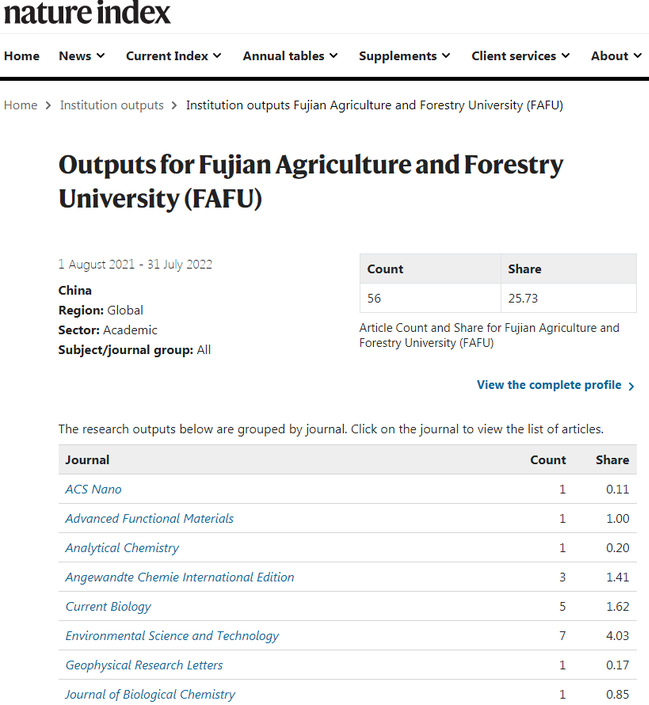 近日,自然出版集团更新了2022年最新的自然指数排名(统计时间节点为2021.8.1—2022.7.31),beat365官网在自然指数内地高校总排名(含化学、地球与环境科学、生命科学和物理学四个学科领域)中位列第105,在国内农林高校中位列第6,位于中国农业大学、西北农林科技大学、华中农业大学、南京农业大学、南京林业大学之后,在全球学术机构中位列第428。
