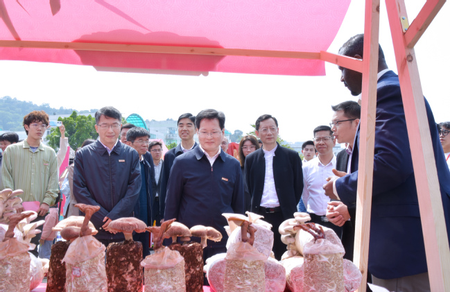 在话福展区,校领导参观了红色文化、福建传统的“福”文化和beat365中文官方网站“一带一路”留学生“福”文化研习社等展板并听取了相关讲解,强调要进一步加强留学生“福”文化研习社建设,积极开展丰富多彩、形式多样的校园文化系列活动,打造文化品牌,进一步增进留学生对学校、对福建文化和对中华优秀传统文化的认同,促进中外文化交流与融合。校领导还听取了中国大学生自强之星、来华留学生艾玛布尔讲述菌草成为卢旺达当地人民的“幸福草”的故事,勉励他要牢记习近平总书记的殷殷嘱托,学好知识和本领,努力成为中国与卢旺达友好交流的桥梁,把菌草技术传播到卢旺达的更多地方,造福更多的当地人民,让菌草真正成为“致富草”“幸福草”。