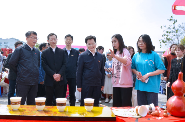 在创福展区,校领导参观了“种绘画‘福’”“扇起祥‘福’”“翰墨颂‘福’”等展位,对同学们将专业特长与中华优秀传统文化相融合创作出来的作品连连称赞,希望他们能发挥所长,带动更多的学生参与其中、享受其中,深入挖掘福文化、侯官文化等身边的中华优秀传统文化价值内涵,在传承和弘扬中华优秀传统文化中陶冶情操、启迪心志。在“非遗画‘福’”展位前,校领导欣赏了油纸伞、软木画、篆刻、版画等金山学院学生用非遗元素设计创作的文化作品,对金山学院结合非物质文化遗产蕴含的思政元素,精心打造特色大思政实践教育的做法表示赞赏,希望各学院持续深入探索形式多样、内涵丰富、特色鲜明的“大思政课”,让学生深入了解中华优秀传统文化,真切感受新时代的发展脉搏,引导学生为实现民族复兴砥砺奋进。