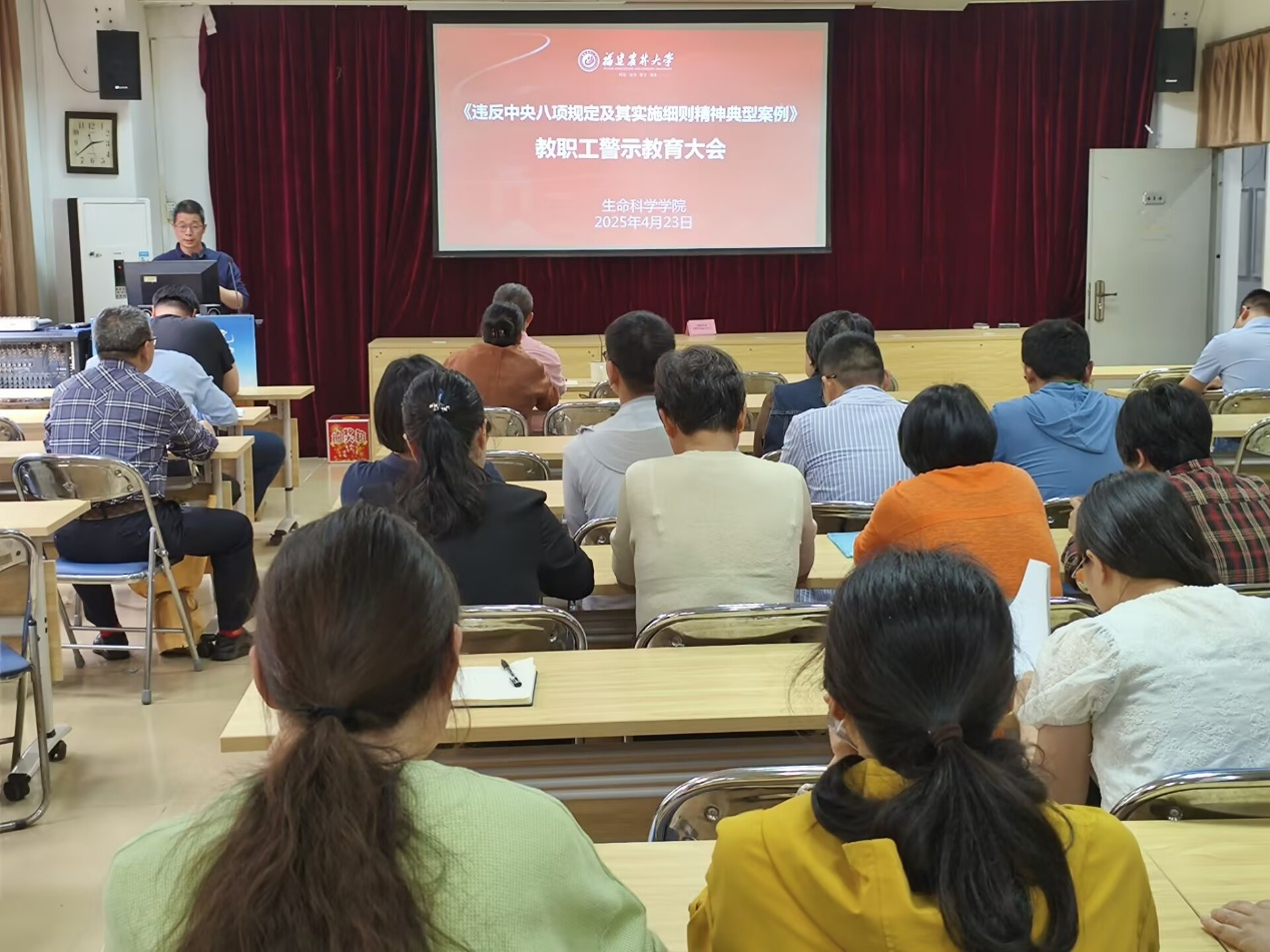 4月25日下午,为扎实推进学院党风廉政建设,教育广大党员干部、教职员工树牢纪法意识,增强遵法守法观念,生科学院召开“违反中央八项规定及其实施细则精神典型案例”警示教育大会,学院领导班子、全院教职工参加教育大会。会议由学院纪委书记陈观水主持。