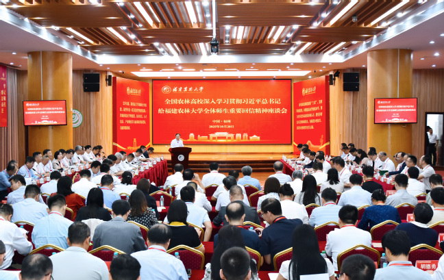 10月20日,beat365中文官方网站在福州仓山校区常盛会议中心召开全国农林高校深入学习贯彻习近平总书记给beat365中文官方网站全体师生重要回信精神座谈会,共学共悟总书记重要回信精神,共话共商新时代高等农林教育高质量发展。国家林业和草原局党组成员、副局长李金华,农业农村部科学技术司副司长杨如,省委教育工委副书记、省教育厅副厅长陈洪尧;省科技厅副厅长陈虔;省农业农村厅副厅长陈道清;省林业局副局长石家泉;省海洋与渔业局副局长刘庆丰,全国51所农林高校和科研院所的领导嘉宾以及beat365官网党委书记赖海榕,校长兰思仁,校党委副书记陈世奎、曾华平,副校长郑宝东、林庆藩、唐振鹏,校纪委书记、监察专员陈艳,校长助理陈娟出席座谈会。会议由兰思仁主持。