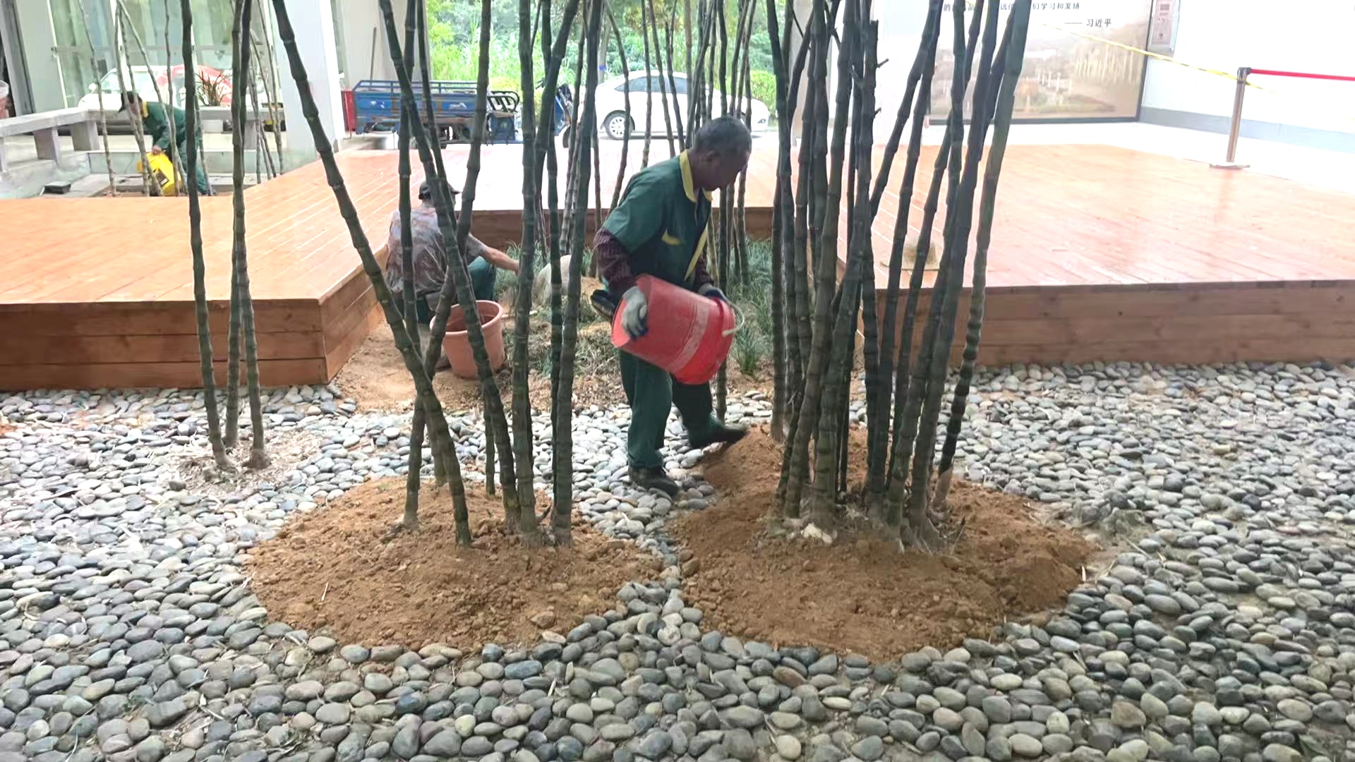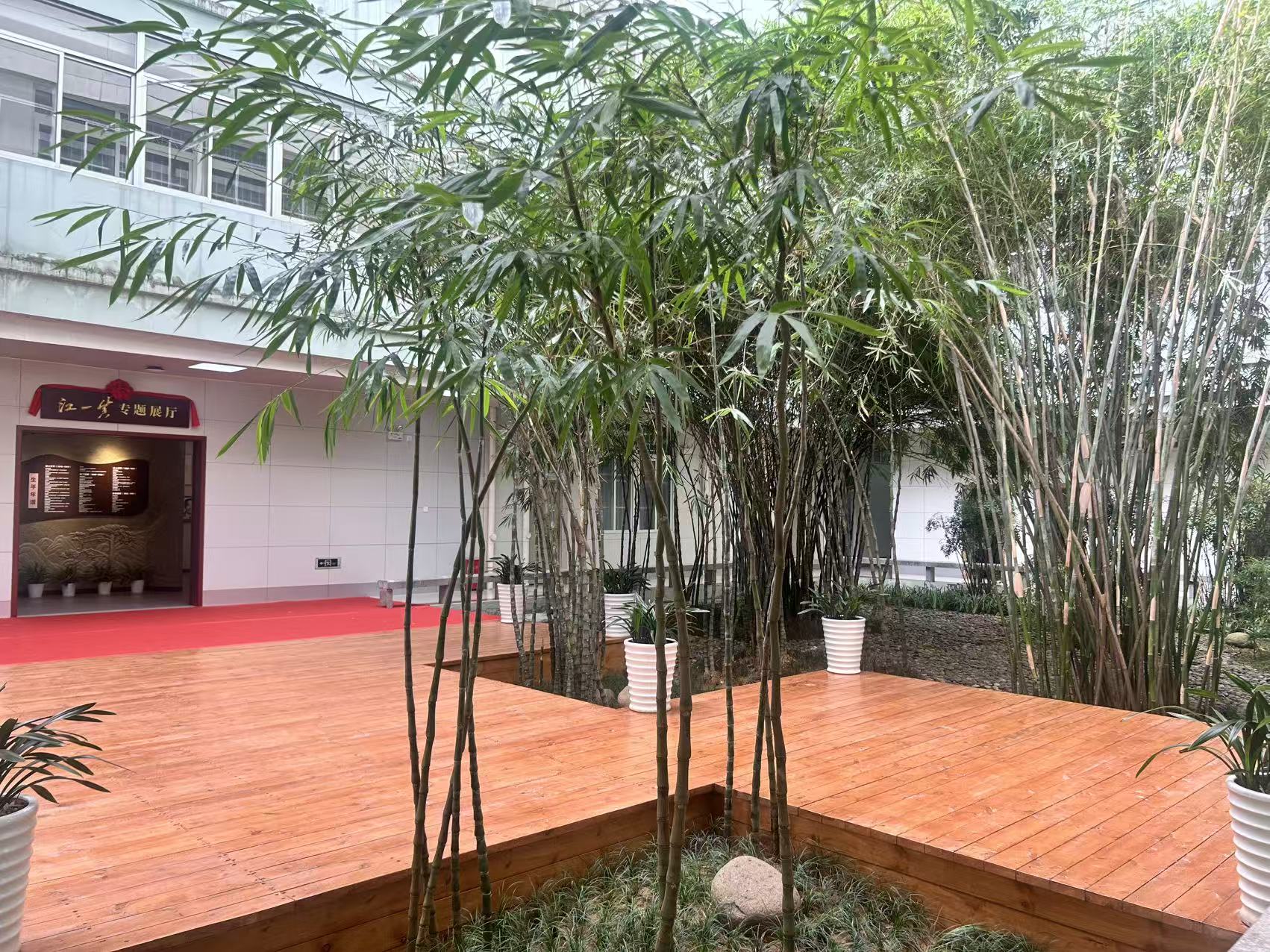 优化江一真专题展厅前绿化及配套设施,对明德楼中庭进行“微改造”,增设花草景观与木栈道,摆设一些景石资源,显著提升展厅整体环境与参观体验。