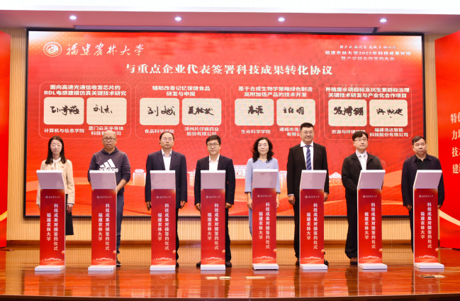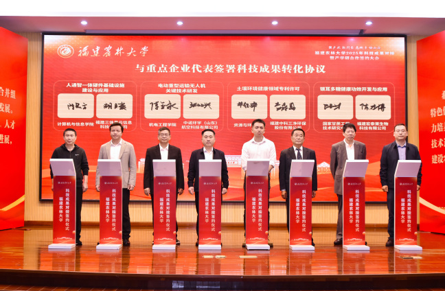 在科技成果对接签约仪式上,学校与华安县、宁化县、浦城县、周宁县、连城县、永春县、东山县等7个县签订战略合作协议,与浦城县忠信镇金凤村、建宁县均口镇均口村、长汀县濯田镇水头村、新罗区雁石镇益坑村等4个乡村振兴示范村签订合作共建协议。同时,学校还与重点企业代表签订了科技成果转化协议,内容涵盖生态改良、低空经济、合成生物学、食品加工等领域,签约的8个项目分别是“人通智一体硬件基础设施建设与应用”“电动重型运输无人机关键技术研发”“土壤环境健康领域专利许可”“银耳多糖健康功效开发与应用”“面向高速光通信收发芯片的RDL电感建模仿真关键技术研究”“辅助改善记忆保健食品研发与申报”“基于合成生物学策略绿色制造高附加值产品的技术开发”“养殖废水磷超标及抗生素超标治理关键技术研发与产业化合作”,总经费超2100万元。
