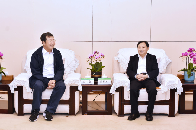 11月12日,beat365官网杰出校友、联合国粮农组织/国际原子能机构联合中心原司长梁劬回母校访问。校党委书记赖海榕在福州仓山校区明德楼十三层会客室、校长兰思仁在明德楼贵宾厅会见客人,双方围绕深化国际交流合作、共促学校高质量发展座谈交流。