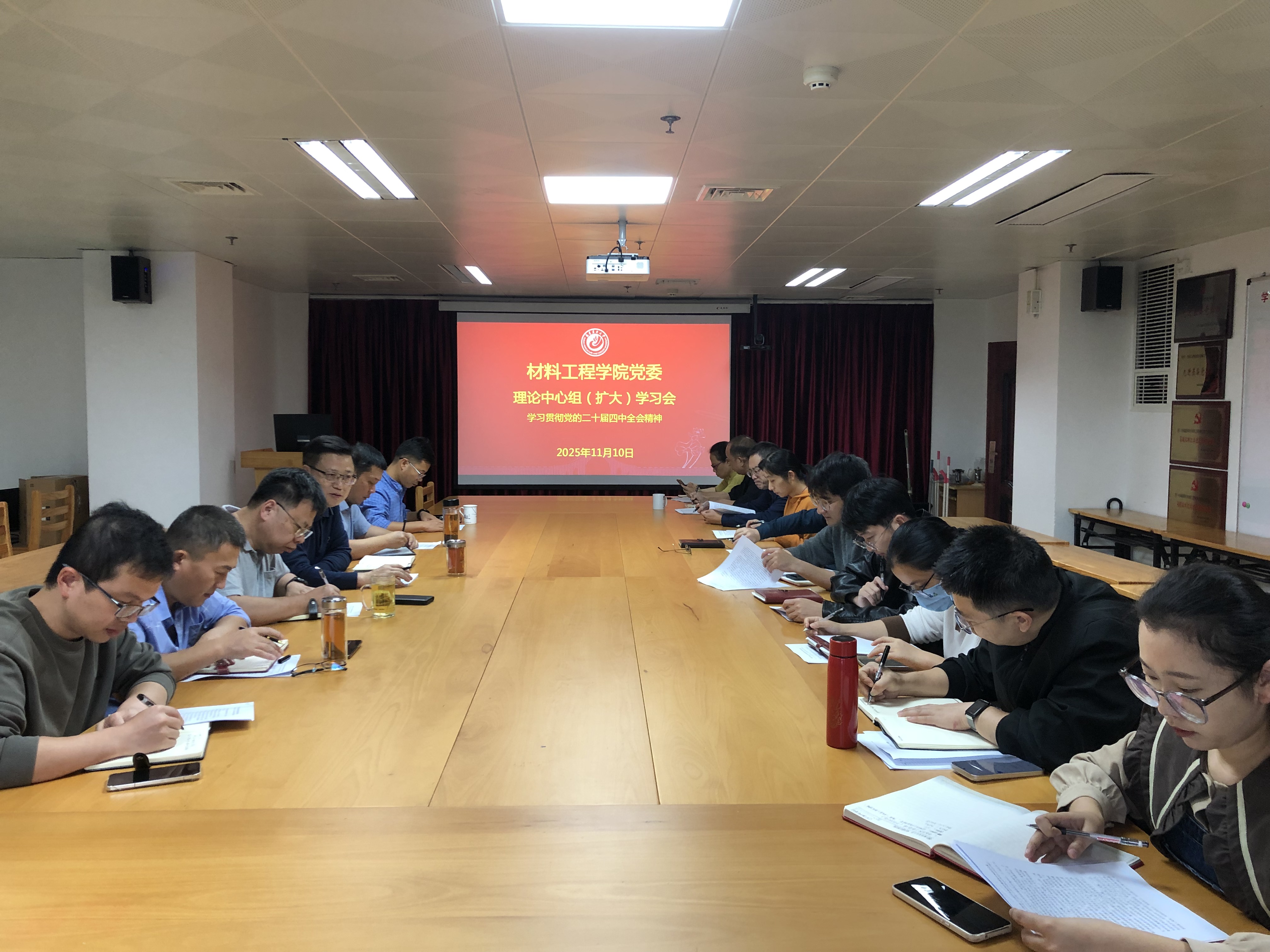 11月10日下午,材料工程学院党委在大学城校区仁德楼423会议室召开理论学习中心组(扩大)学习会,专题传达学习习近平总书记在党的二十届四中全会上的重要讲话精神和全会精神,研究安排学院贯彻落实工作。学院领导、党委委员、科级干部、全体辅导员参加学习会。会议由学院党委书记林豪森主持。