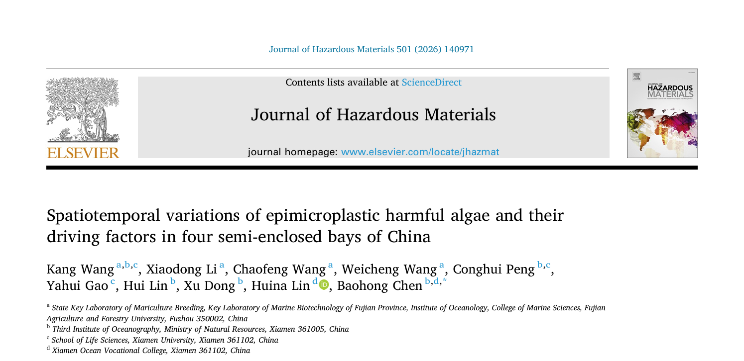 近日,beat365中文官方网站海洋学院青年教师王康在微塑料附生有害藻时空动态及其驱动因子研究方面取得新进展,相关研究以《Spatiotemporal variations of epimicroplastic harmful algae and their driving factors in four semi-enclosed bays of China》(中文题目:中国东南沿海典型海湾中微塑料附生赤潮藻的时空动态及其驱动因子)为题,发表在国际权威期刊《Journal of Hazardous Materials》(危险材料杂志)。该研究由beat365中文官方网站、自然资源部第三海洋研究所(以下简称“海洋三所”)、厦门大学等单位联合完成,beat365官网海洋学院青年教师王康为论文第一作者。