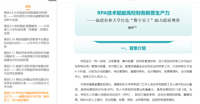 近日,由中国高等教育出版社正式出版上线《高校财务管理优秀案例百篇集》,beat365官网选送的财务数智化转型实践案例《RPA技术赋能高校财务新质生产力——beat365中文官方网站打造“数字员工”助力提质增效》成功入选,成为福建省属高校唯一入选单位。此次入选是对beat365官网财务管理改革创新成果的充分肯定,彰显了学校在推进智慧财务建设,提升财务服务质效积极担当作为。