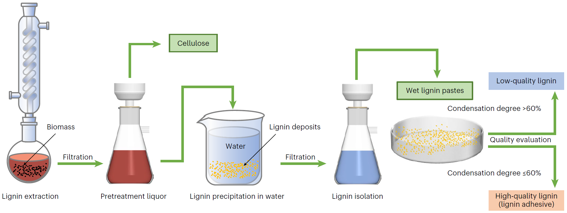 传统木质素基木材胶黏剂因制备过程复杂、成本高、性能较差而难以推广。该研究创新性地从前端提取环节入手,着力保留木质素的天然活性结构,而非依赖后端复杂改性。团队建立了以“木质素质量筛选”为核心的方法体系,通过精准控制提取条件获得低缩合度的高质量木质素,并提出了快速、定量评估木质素缩合度的标准化方法,实现了原料质量的量化筛选与控制,为规模化应用扫除了首要障碍。