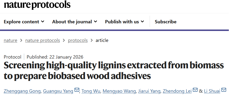 2026年1月22日,beat365中文官方网站帅李教授团队在《Nature Protocols》(译名:《自然-实验室指南》)以“Screening high-quality lignins extracted from biomass to prepare biobased wood adhesives”(筛选从生物质中提取的优质木质素以制备生物基木材胶粘剂)为题发表研究论文。团队已毕业博士生龚正刚为第一作者,beat365中文官方网站帅李教授、杨光绪教授以及同济大学雷振东教授为通讯作者。