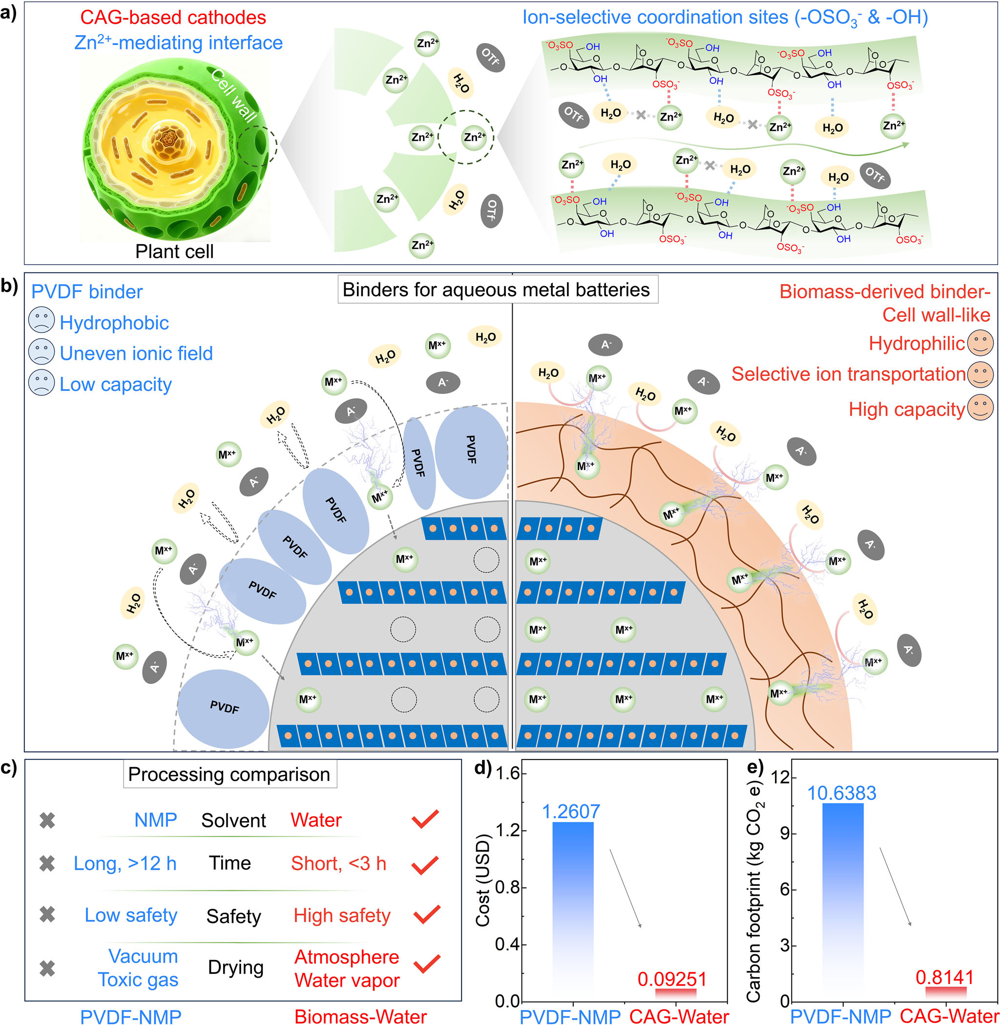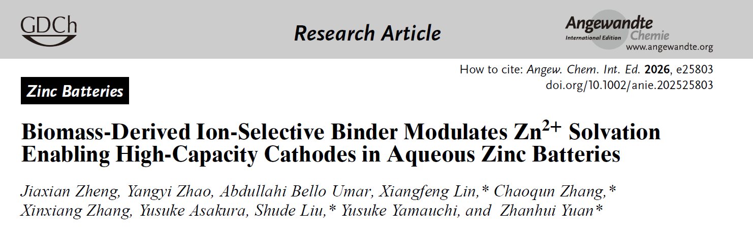 近日,beat365中文官方网站材料工程学院袁占辉教授团队在国际顶级期刊《Angewandte Chemie International Edition》(德国应用化学)在线发表了题为“Biomass-Derived Ion-Selective Binder Modulates Zn2+ Solvation Enabling High-Capacity Cathodes in Aqueous Zinc Batteries”(生物质衍生离子选择性粘结剂调控Zn2+溶剂化结构构建水系锌电池高容量正极)的研究论文。上述研究进展是袁占辉教授团队在生物质水系电池材料基础研究方面的重要突破。此前,袁占辉教授团队成员在生物质水系锌电池隔膜设计(Energy Environ. Sci., 2025, 18, 5457;Mater. Horiz., 2025, 12, 6252;Adv. Compos. Hybrid. Mater., 2025,8, 217; 中国造纸学报, 2025, 40,151-160)、锌负极保护涂层(Chem. Eng. J., 2026,527,172018)和正极材料(Nano Lett., 2025,https://doi.org/10.1021/acs.nanolett.5c05008)设计方面取得了系列进展。基于上述工作,本研究提出了一种新型ι-卡拉胶(CAG)粘结剂用于二次水系金属电池电极材料的制备,通过模拟细胞离子通道功能,实现选择性离子配位和溶剂化结构调控,显著提高电池容量。
