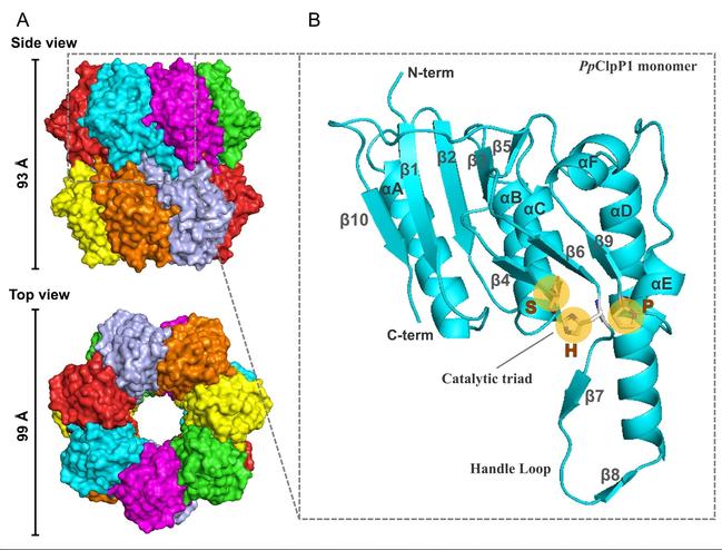 该研究发现大黄鱼变形假单胞菌中存在两种同源的ClpP蛋白酶亚基—PpClpP1和PpClpP2。生化分析表明,PpClpP2催化效率显著较高;而PpClpP1则相对活性较低(图1)。借助冷冻电镜技术,研究团队成功解析了PpClpP1的三维结构(图2)。结果显示,PpClpP1虽然组装成典型的十四聚体结构,却拥有两个与众不同的特征:一是非常规的“丝氨酸-组氨酸-脯氨酸”催化三联体构型(传统为丝氨酸-组氨酸-天冬氨酸),二是异常扩张的轴向孔道。相比之下,结构模拟预测的PpClpP2则具有与解折叠酶PpClpX相互作用的关键元件,而这些元件在PpClpP1中完全缺失。