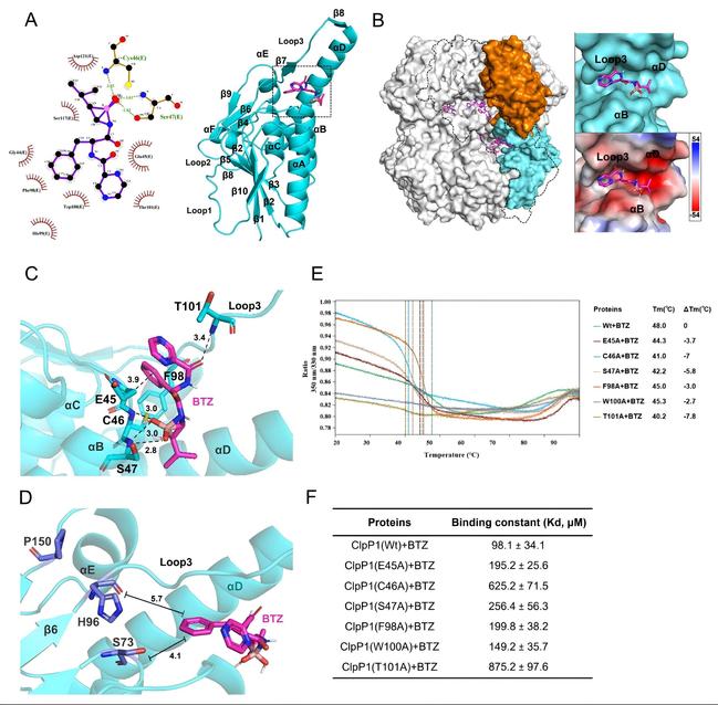 蛋白酶抑制剂硼替佐米对变形假单胞菌表现出抑制作用。通过等温滴定量热实验(ITC)和分子对接等前沿技术,证实BTZ能特异性结合PpClpP1(而非PpClpP2),从而抑制其酶活(图3)。基因敲除实验证实,BTZ的抑菌效果正是依赖于靶向PpClpP1实现,敲除该基因后,药物便失去了作用。该研究首次报道了变形假单胞菌PpClpP1蛋白酶的结构特征,揭示了针对该病原菌的ClpP抑制机制,不仅丰富了对病原菌蛋白质降解系统及致病机制的认知,也为有针对性地开发新型水产抗菌药物提供了关键靶点。