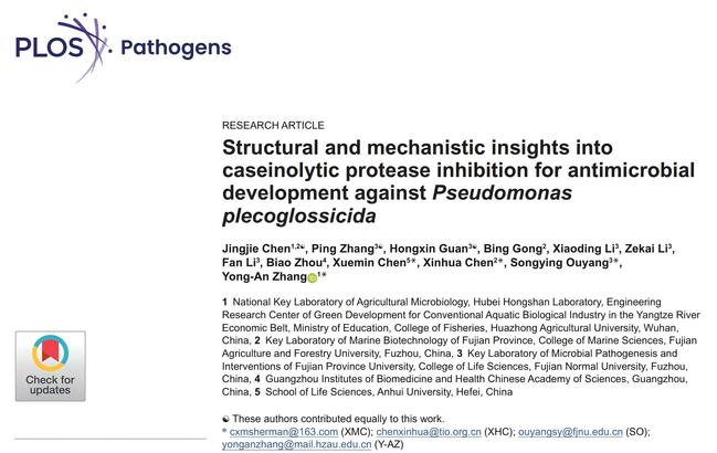 2026年2月12日,国际学术期刊《PLoS Pathogens》-《公共科学图书馆·病原体》在线发表了beat365中文官方网站海洋学院陈新华团队的最新研究成果,论文题目为“Structural and mechanistic insights into caseinolytic protease inhibition for antimicrobial development against Pseudomonas plecoglossicida” -“基于酪蛋白水解酶结构解析与抑制机制的新见解助力抗变形假单胞菌药物研发”。大黄鱼(Larimichthys crocea, Lc)是我国重要的海水经济鱼类,变形假单胞菌(Pseudomonas plecoglossicida,Pp)是导致其内脏白点病(VWND)的病原,该病每年流行给大黄鱼养殖业造成重大经济损失。该研究揭示了大黄鱼变形假单胞菌中一种具有独特Ser-His-Pro催化三联体的酪氨酸蛋白酶PpClpP1的水解机制,并且蛋白酶抑制剂硼替佐米(Bortezomib,BTZ)可特异性靶向PpClpP1对变形假单胞菌起到抑菌作用。这一发现不仅为理解变形假单胞菌的致病机制提供了新视角,也为有针对性地研发新型水产抗菌药物提供了关键靶点。
