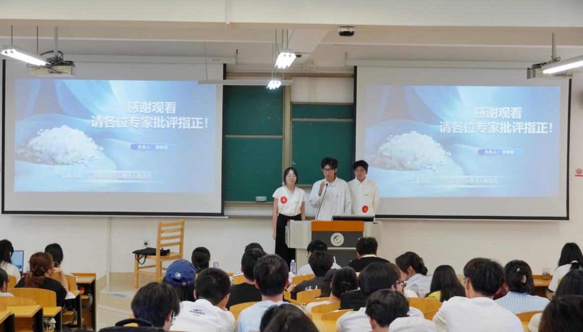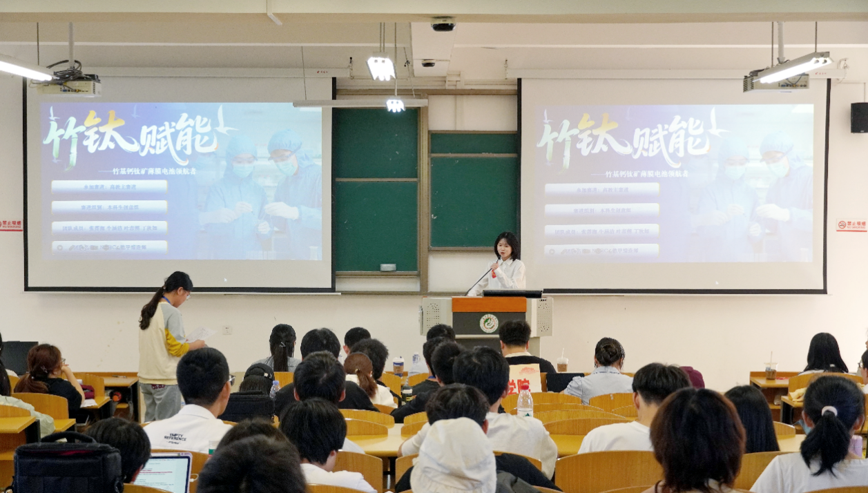 比赛中,各团队围绕学院学科前沿,展示了具有鲜明创新特色和应用前景的项目成果。如,“竹芯科技——竹纤维基真空绝热板全球领跑者”团队聚焦绿色高效绝热材料,助力建筑节能与冷链物流绿色升级;“竹纤绿能——高性能纳米流体膜盐差能发电器件”项目利用竹纤维素制备高性能纳米流体膜,在新能源领域展现出良好的应用潜力;“竹钛赋能——竹基钙钛矿薄膜电池领航者”团队则创新性地以竹材为基底开发柔性钙钛矿电池,为新能源与竹产业融合提供了新路径;“电光焕彩——新型有机电致变色储能材料的引领者”团队致力于研发具有快速响应与长寿命特点的电致变色材料,推动节能与智能技术融合发展……无论是面向科技前沿的科学探索,还是针对产业实际的技术应用,各团队均展现出扎实的专业素养与活跃的创新思维。在答辩环节中,评委就技术可行性、应用场景等方面提问,选手从容应答,现场交流深入、气氛热烈。