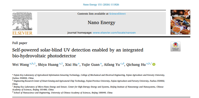相关成果以“Self-Powered Solar-Blind UV Detection Enabled by an Integrated Bio-Hydrovoltaic Photodetector”为题发表于《Nano Energy》(中科院一区TOP,IF=17.1),并入选当期主封面。