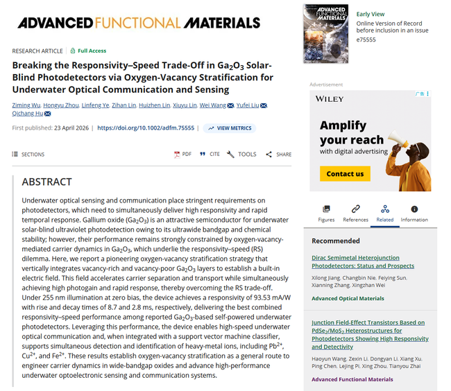 该研究成果以“Breaking the Responsivity–Speed Trade-Off in Ga₂O₃ Solar-Blind Photodetectors via Oxygen-Vacancy Stratification for Underwater Optical Communication and Sensing”为题发表于《Advanced Functional Materials》(自然指数收录,中科院一区TOP,IF=19.0)。