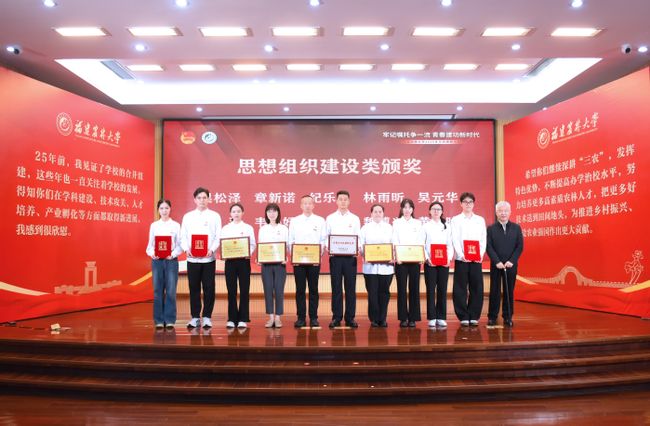 与会领导分别为获得2025年度社会实践类、文艺体育类、志愿服务类奖项,2025年度科技创新类奖项,2025年度思想组织建设类奖项的获奖代表颁奖。