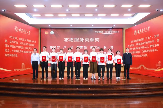 校党委副书记曾华平、副校长郑宝东为获得志愿服务类奖项的获奖代表颁奖